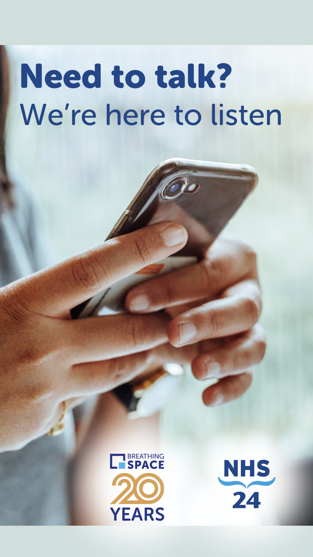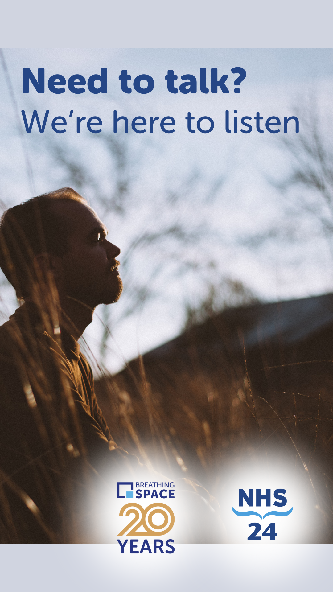 To celebrate Breathing Space's important milestone, NHS 24 would appreciate your support in sharing the campaign key messages and resources to relevant audiences throughout 2024. The 'Breathing Space - 20th anniversary toolkit' and other publicity resources contain helpful information and are available to download at the bottom of this email.