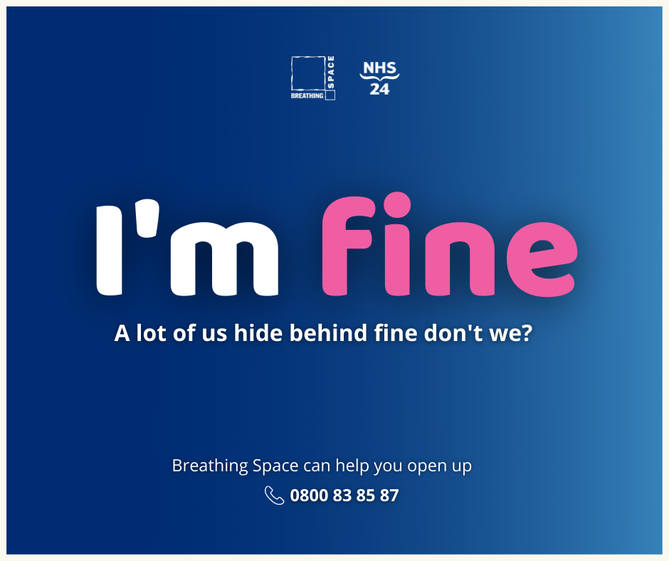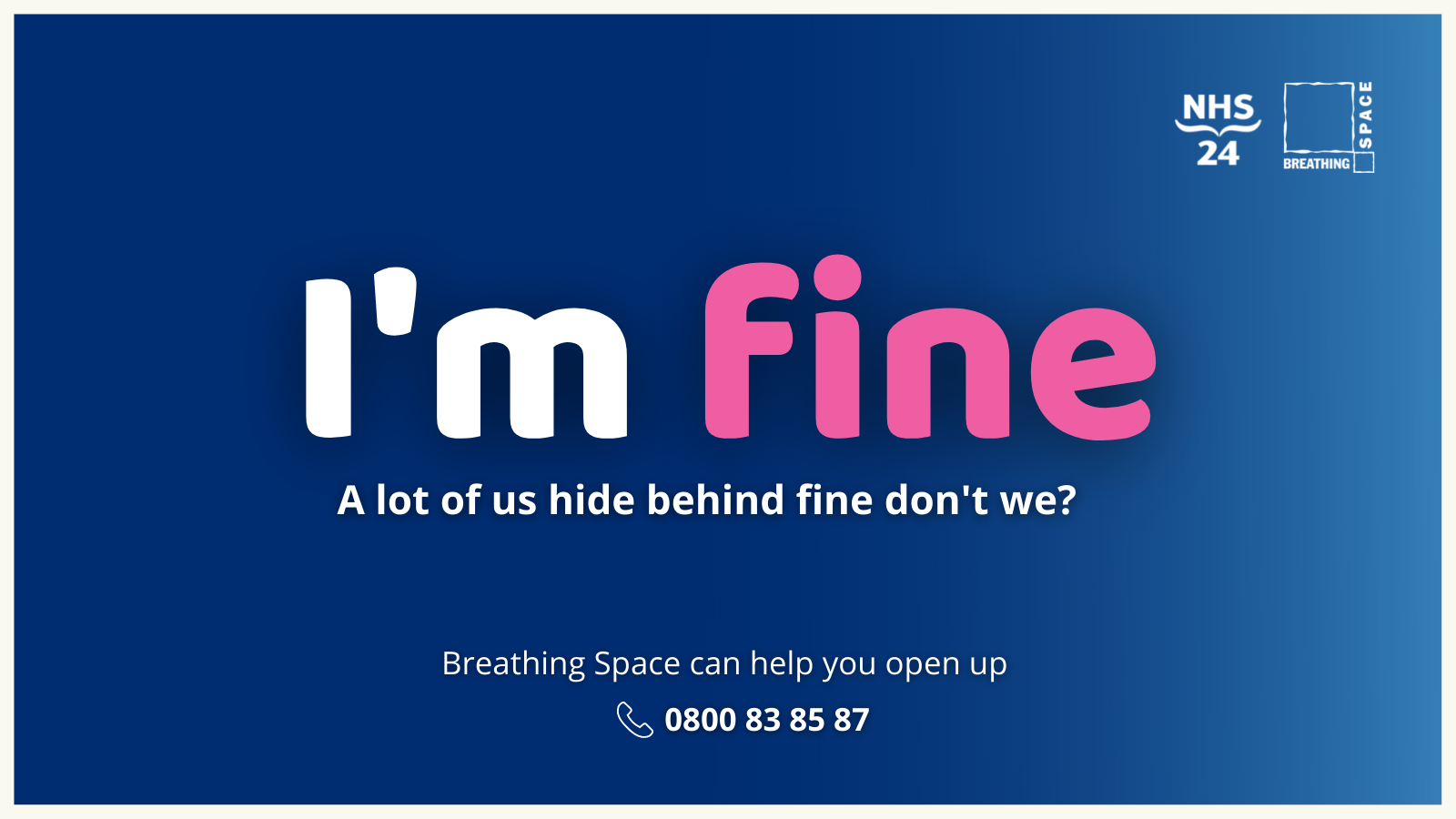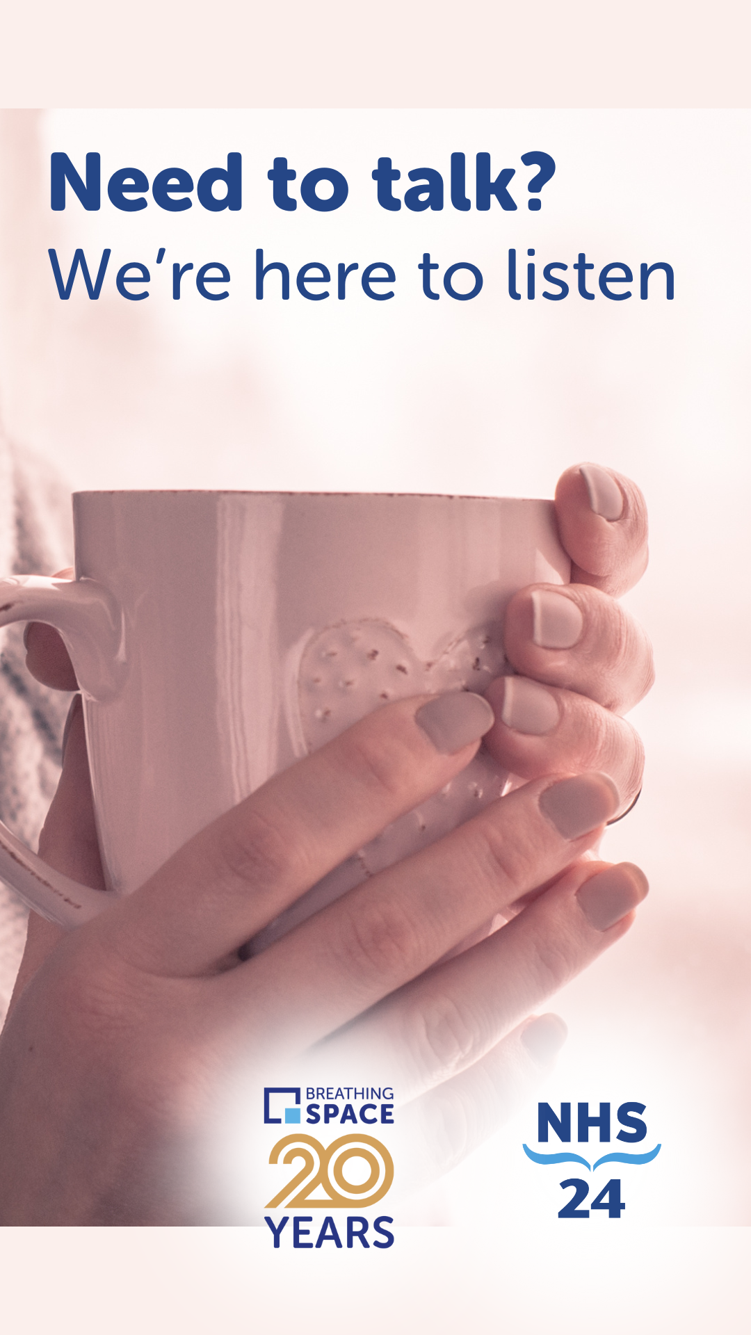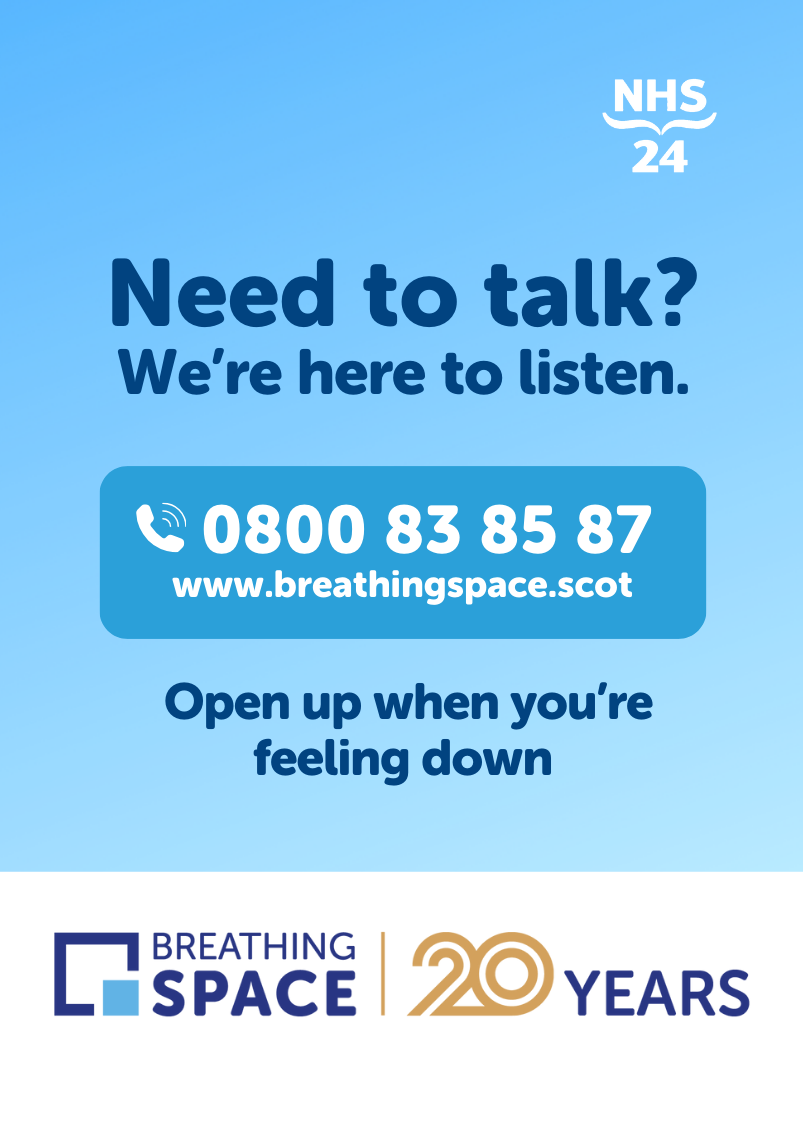 Breathing Space is a free and confidential phone and web chat service for anyone in Scotland aged 16 and over experiencing low mood, depression, or anxiety. Delivered by NHS 24, the service is available in the evenings (6pm to 2am weekdays) and 24 hours at the weekend (Fri 6pm to Mon 6am) on 0800 83 85 87. The web chat service can be accessed from breathingspace.scot.